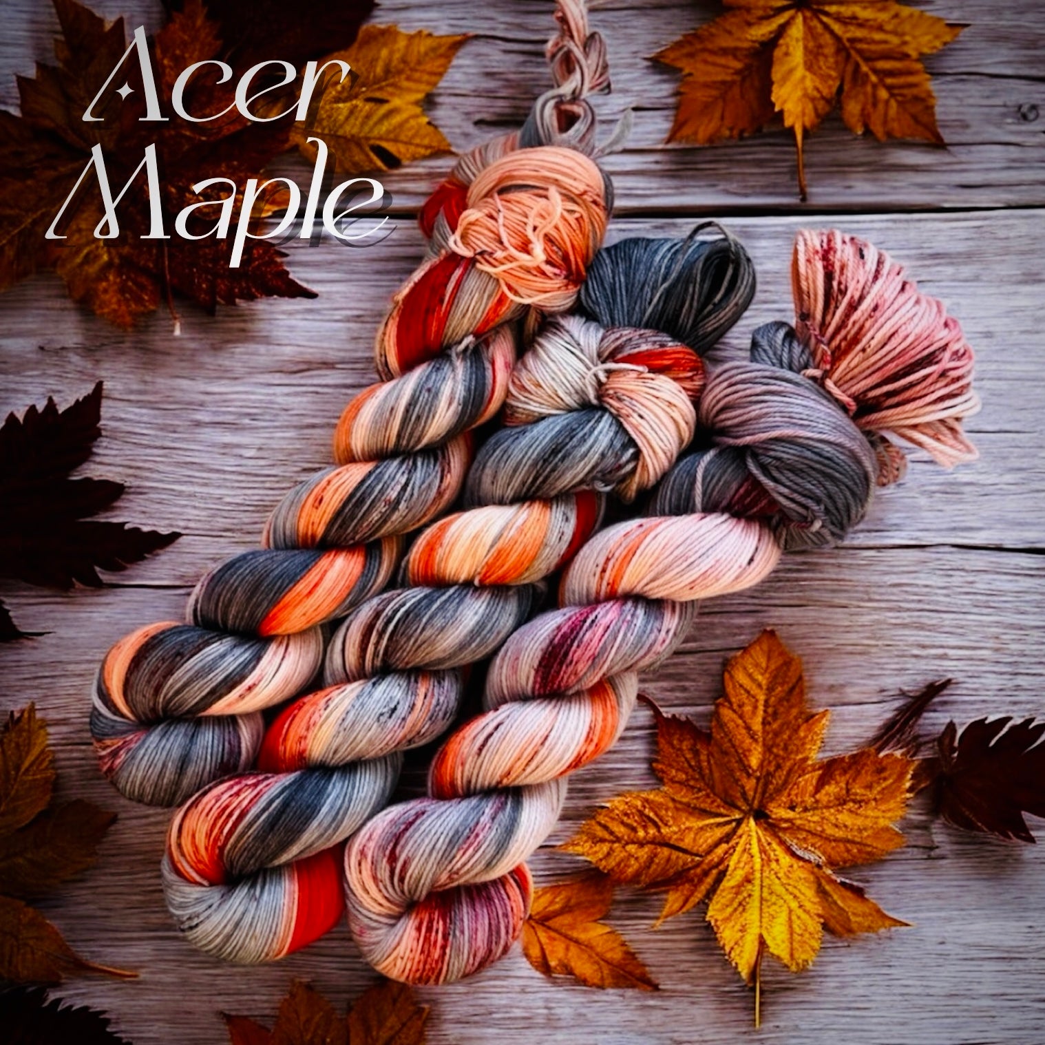Celebrate autumn's glory with Acer Maple, a yarn inspired by nature's most dazzling colour show. Warm amber, burnt orange, and deep crimson hues blend together like leaves caught in golden sunlight, bringing that cozy fall feeling to every project. Perfect for sweaters, scarves, and blankets that practically hug you with warmth. Let your needles dance through these rich, inviting tones and create pieces that capture the magic of the season—because who says you can't wear autumn all year long?