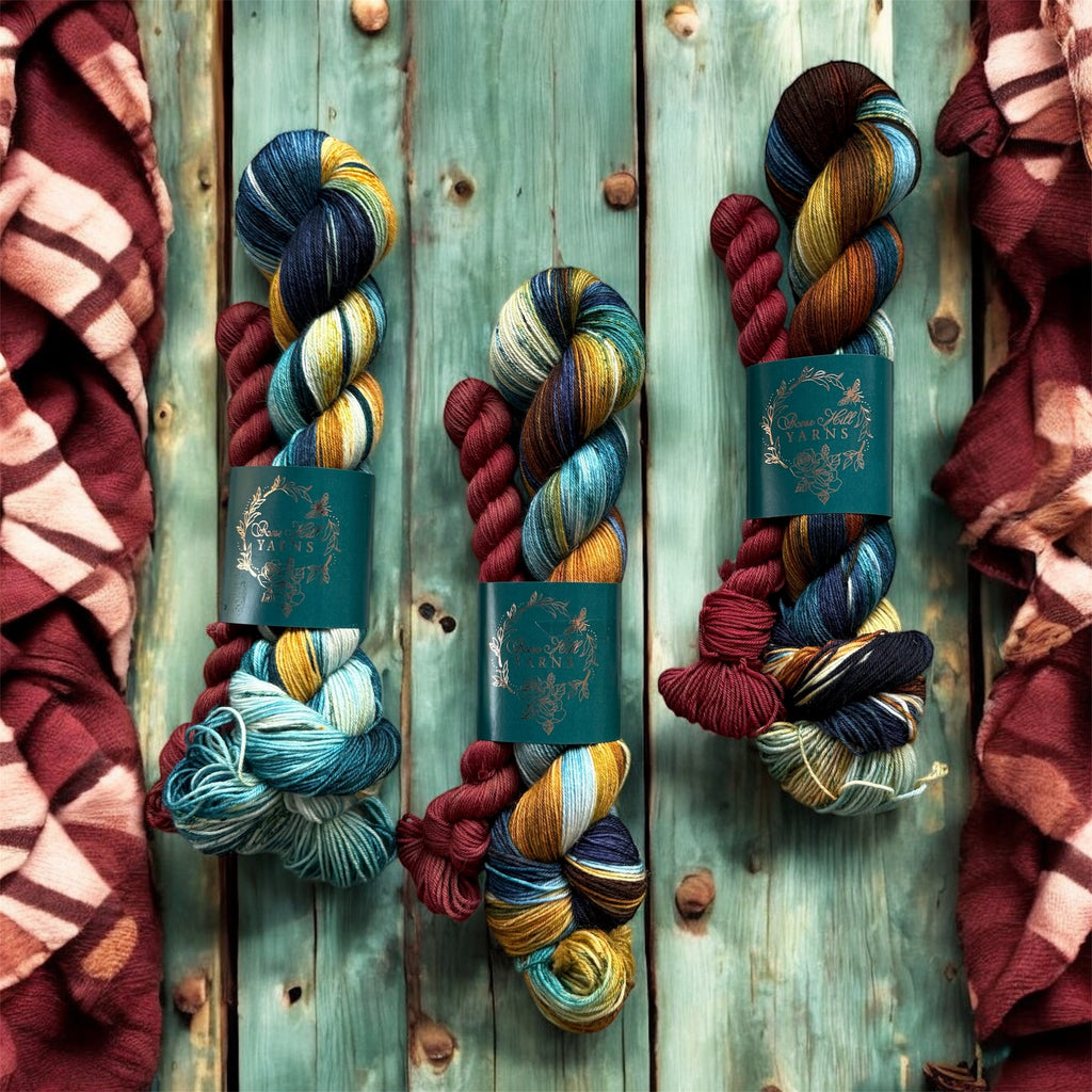 September's Flannel & Apple Yarn Club features a charming blend of golden caramel shades with a spectrum of teal from light to deep midnight. It comes paired with a cute mini in flannel red for extra cozy vibes.