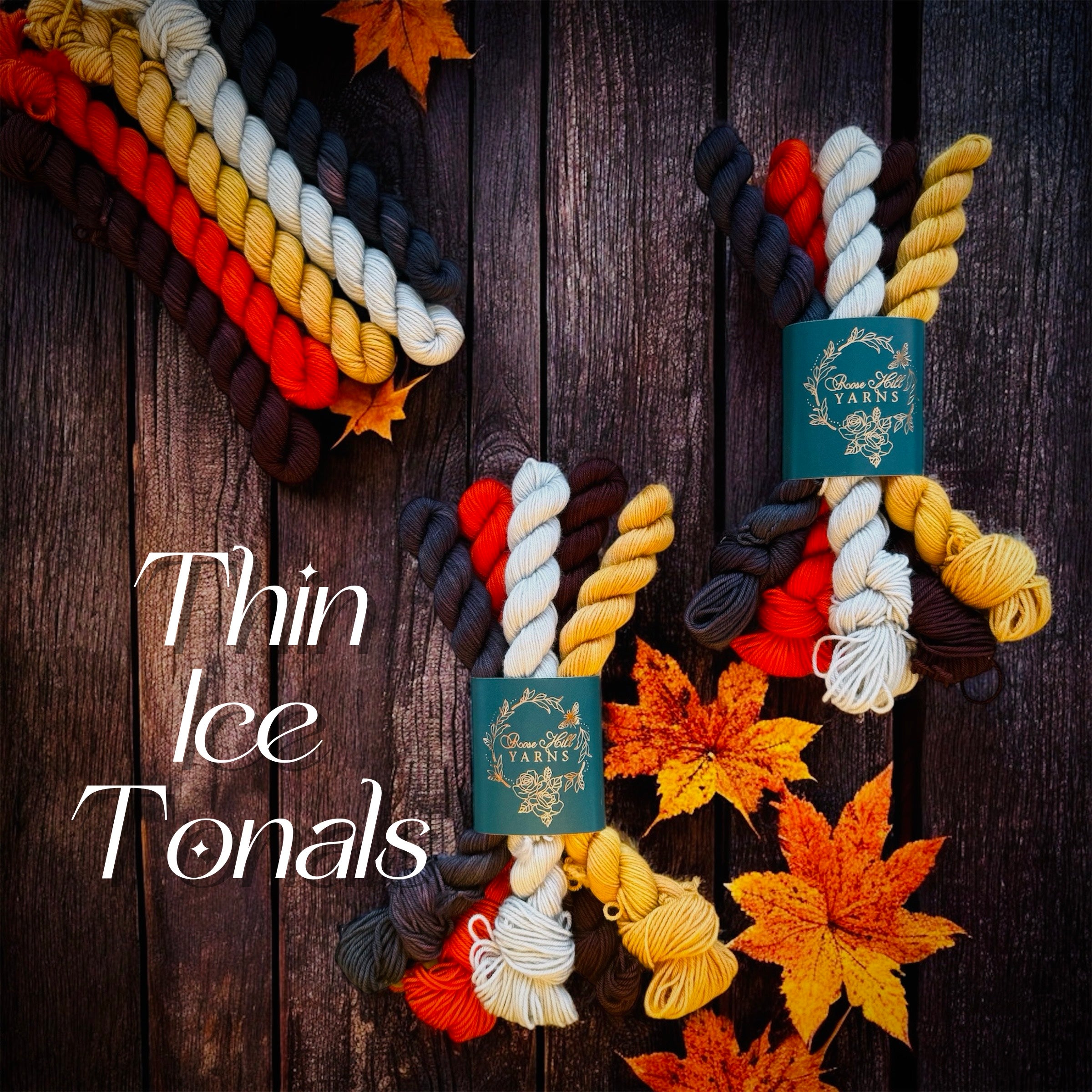 Celebrate the magic of seasonal transition with this enchanting yarn set that blends autumn's warmth with winter's crisp elegance. Inspired by leaves kissed by early frost, these tonals feature golden ambers, copper tones, and deep burgundies that dance together in harmonious color. The thin, airy construction makes it wonderfully versatile—perfect for draping shawls, delicate wraps, or any project where you want color to whisper rather than shout. Mix and match skeins for stunning colorwork, or let each tonal's gentle variations create depth all on their own. Knit something that feels like holding autumn in your hands as winter arrives.