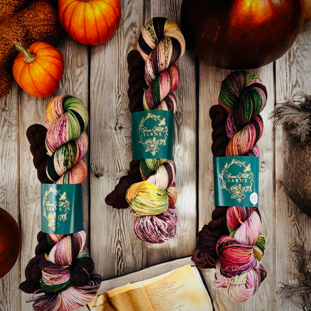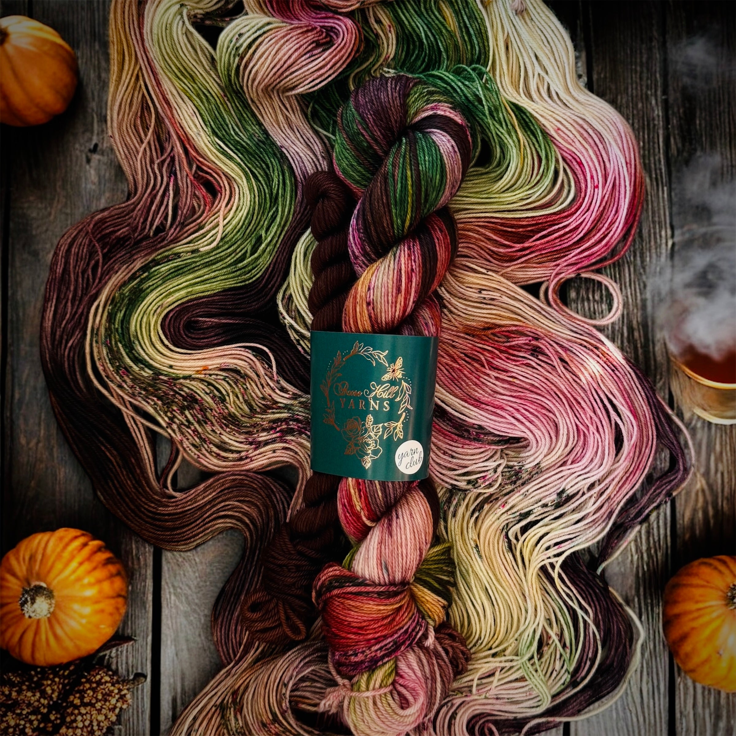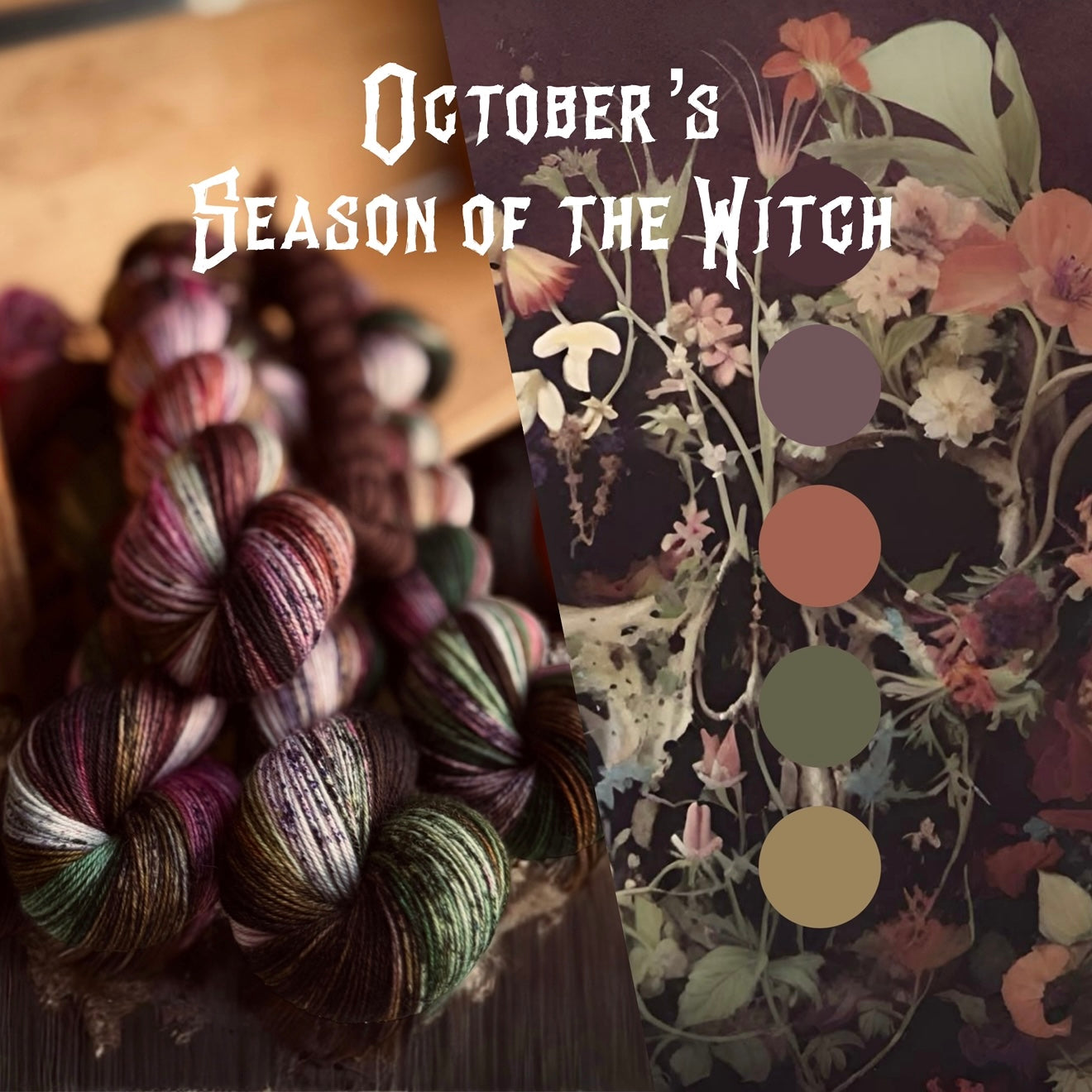 October’s Season of the Witch yarn features enchanting swirls of rich green, deep purples, and warm browns, highlighted with cheerful bursts of peach. Delightfully speckled in shades of purple and green, it’s perfect for casting a colourful spell on your next project.